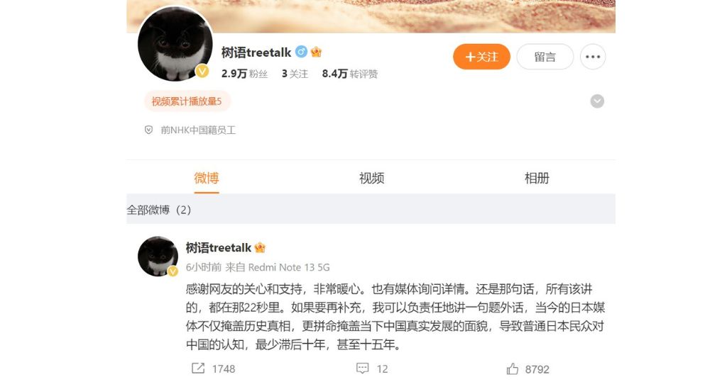 日本放送協會(NHK)一名中國籍播音員日前在節目中突然脫稿,並用中文播報「釣魚島是中國領土」,引發中日兩國熱議。在微博上,一個認證為「前NHK中國籍員工」的帳戶「樹語treetalk」今日(29日)發文稱,「所有該講的都在那22秒裏」,又稱當今日本媒體不僅掩蓋歷史真相,更拼命掩蓋當下中國真實發展的面貌,導致普通日本民眾對中國的認知最少滯後10年,甚至15年。