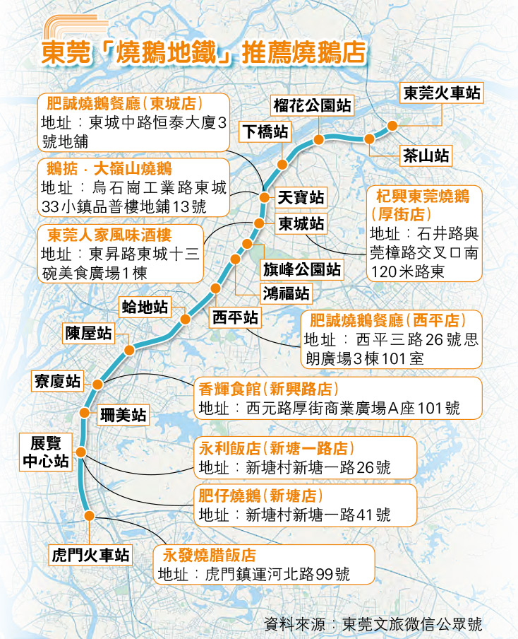 【明報專訊】東莞燒鵝遠近馳名,一碗皮脆油香的燒鵝瀨對愛好燒味的港人是難以抗拒。隨着貫通大灣區5市的城際列車開通,東莞近期大力宣傳「吃燒鵝,進莞來」,並製作多款「燒鵝地圖」讓老饕按圖索驥,其中連接廣深港高鐵虎門站及東莞站的東莞地鐵2號線,沿線多個地鐵站附近不乏老字號燒鵝店,這條「燒鵝地鐵」交通方便,最適合港人尋味。