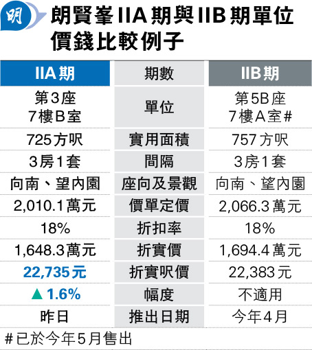 發展商表示,是次推出單位的樓層、座向及景觀略有不同,相比IIB期屬原價加推,維持原有4個付款方法,最高折扣率為18%。不過,個別單位售價較IIB期同類單位加價約1.6%,如IIA期3座7樓B室,實用725方呎3房1套戶,向南望內園,折實價1648.3萬元、呎價約2.27萬元;而IIB期5B座7樓A室,實用757方呎3房1套戶,向東南望內園,4月推出時折實價1694.4萬元、呎價約2.24萬元,兩者相差約1.6%。分兩期、提供990伙的朗賢峯,自今年4月推售至今累沽逾609伙,套現77.5億元。