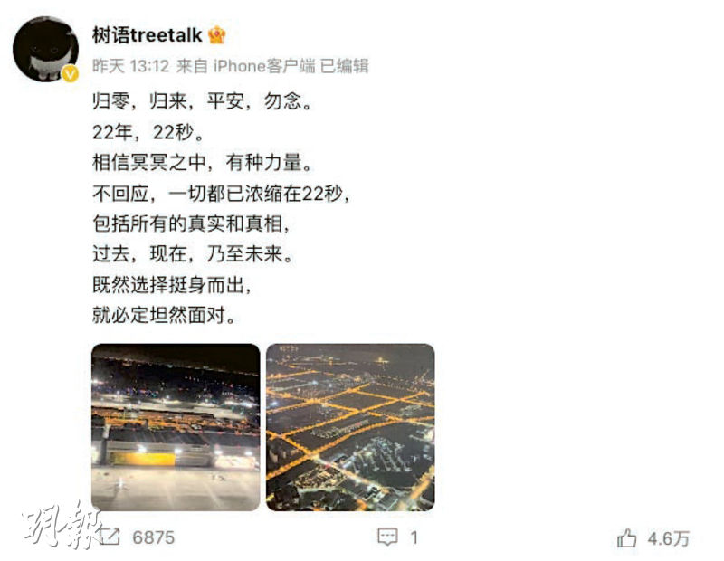 「樹語treetalk」26日發文稱在日本22年,如今「歸零」,已安全回國,其IP地址顯示為雲南,自我介紹顯示生日為1945年8月15日(即日本二戰投降日),帳號註冊時間為今年8月21日。「樹語treetalk」禁止其他用戶在其帖文下方留言。