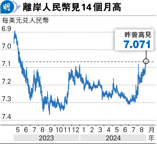 分析認為,市場結匯意願上升,帶動人民幣匯價反彈,但是有消息指國有大銀行曾出手緩和人民幣升勢。高盛認為,企業可能尚未充分準備放棄所持美元資產,部分投資者高估可兌換回人民幣的中國囤匯量。高盛指出,中美息差較大,且內地風險情緒不佳,美元資產仍然具有吸引力,估算內地出口商自2022年中以來積累外匯約4000億美元,並估計人民幣升值大部分受聯儲局加快減息和美國即將大選等因素影響。