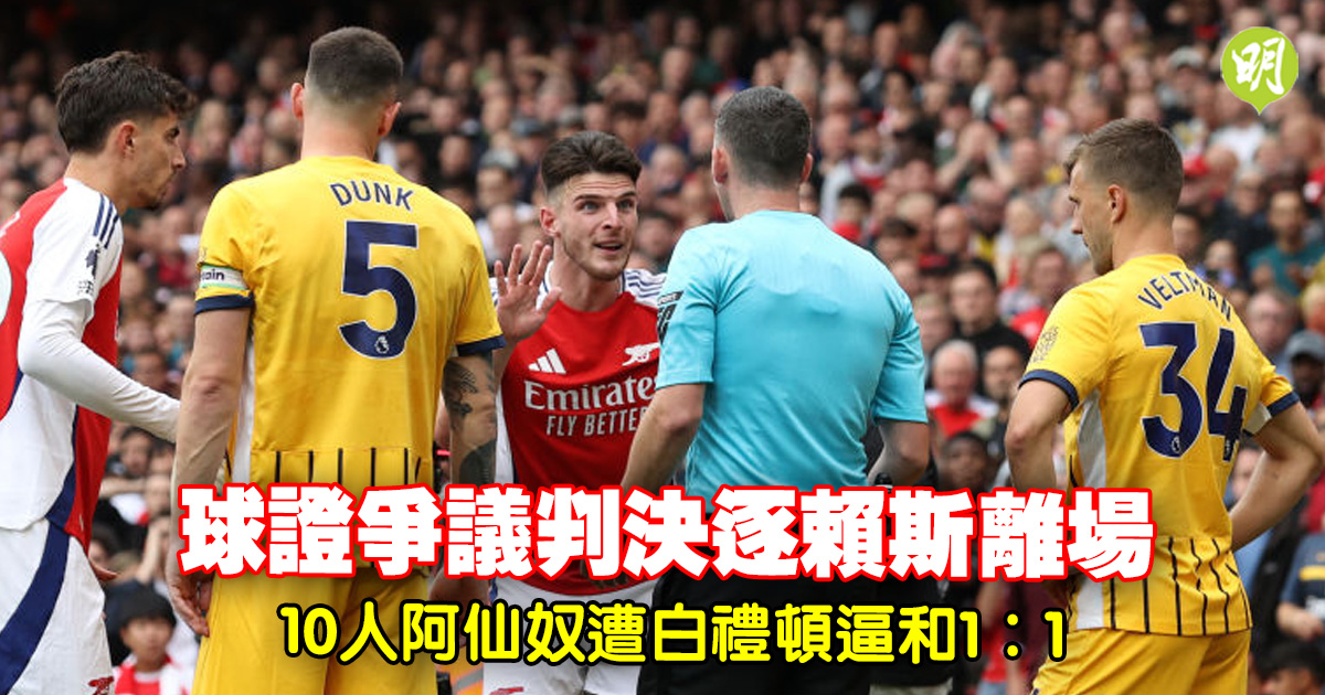 英超|球證爭議判決逐賴斯離場 10人阿仙奴遭白禮頓逼和1:1 (21:45)