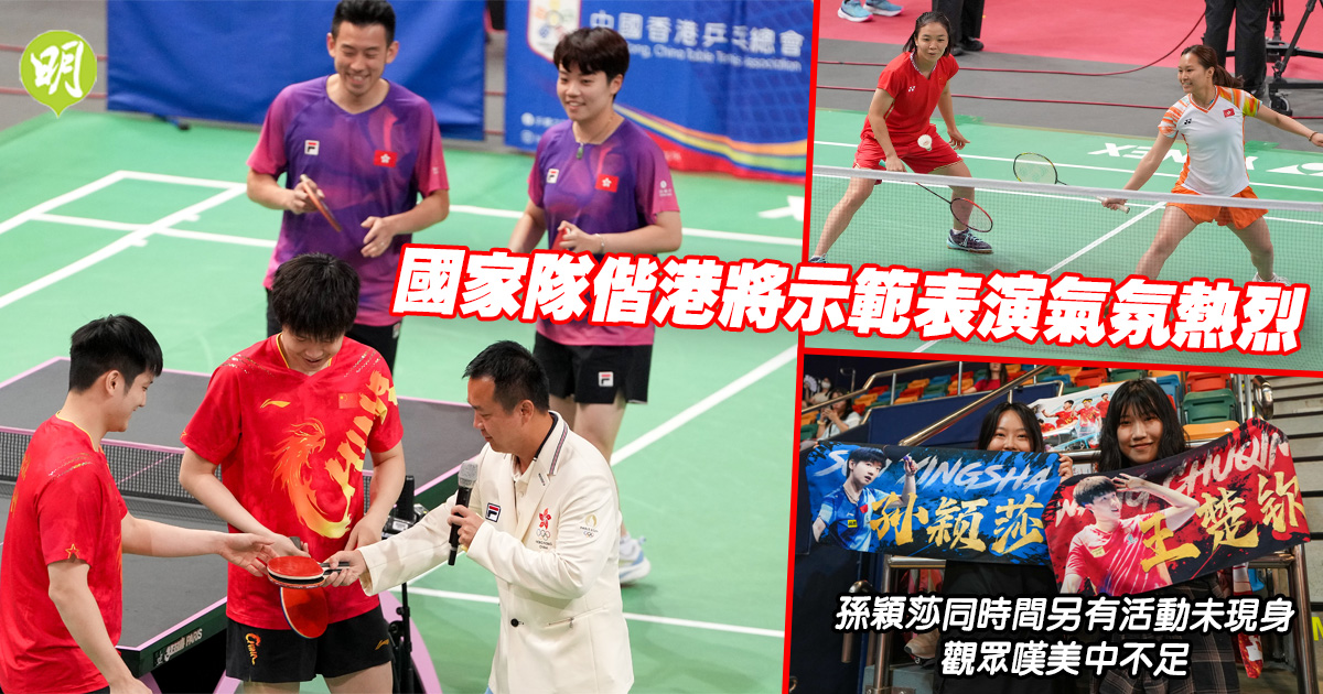 至於乒乓球隊星將孫穎莎,則與「飛魚」張雨霏等國家隊代表出席由香港奧林匹克之友及香港都會大學合辦的青少年交流活動,與超過100名香港青少年分享奧運經驗。在伊館的部分觀眾對於孫穎莎未有現身感失望,但對於能夠現場看國家隊乒乓球代表與港將過招感高興。