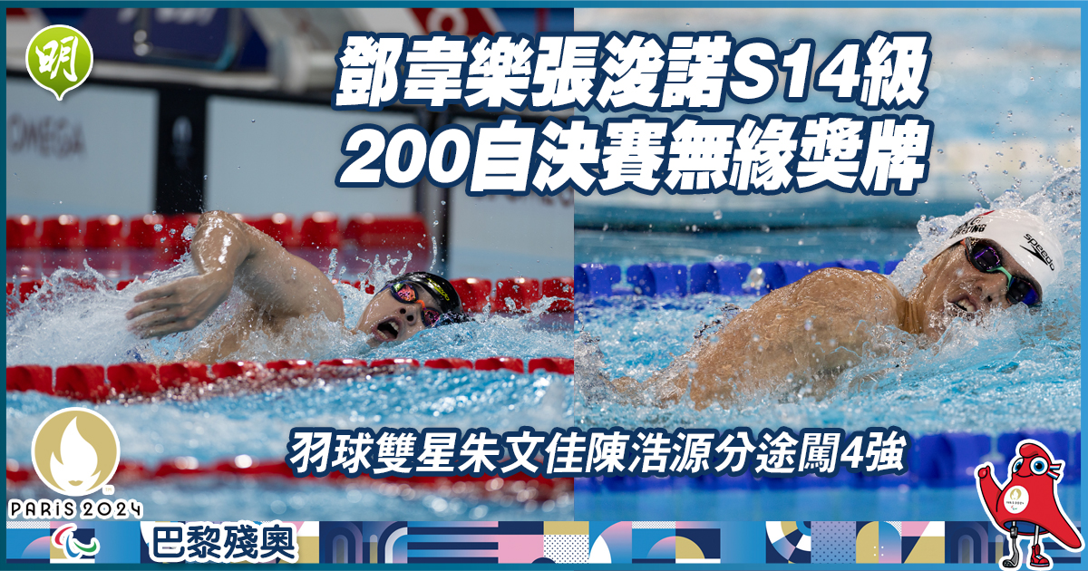 曾在2016年里約殘奧奪金的鄧韋樂,與「師弟」張浚諾昨午在巴黎殘奧男子S14級200米自由泳的初賽晉級後,同晚在決賽分列第7及8名,與獎牌緣慳。至於港隊羽毛球雙星朱文佳及陳浩源則分途於男子SH6級及WH2級小組取兩連勝,殺入4強。
