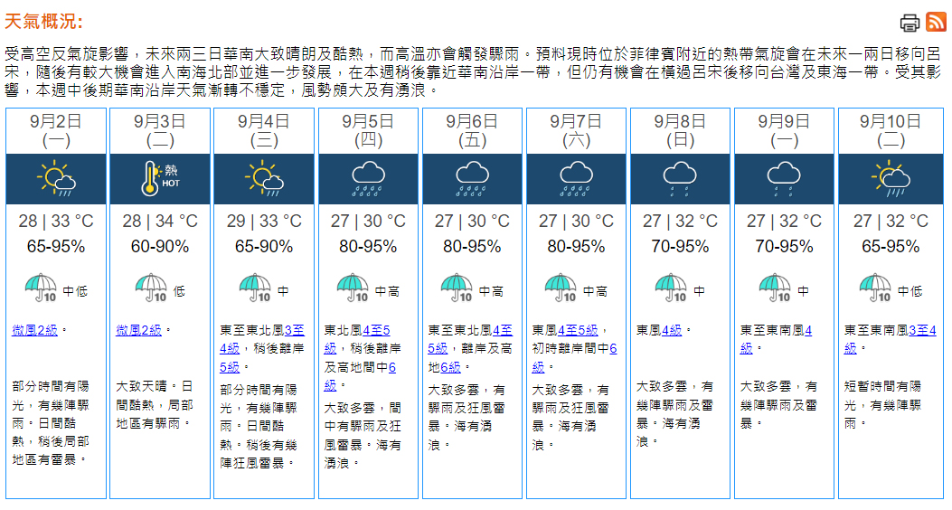 【19:20】本港地區今晚(9月1日)及明日(9月2日)天氣預測:漸轉多雲,有幾陣驟雨。明早最低氣溫約28°C。日間部分時間有陽光及酷熱,市區最高氣溫約33°C,新界再高一兩度,稍後局部地區有雷暴。吹微風。展望隨後一兩日仍然酷熱,亦有幾陣驟雨。本周中後期天氣漸轉不穩定,風勢頗大及有湧浪。