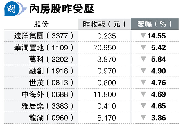 受8月銷情疲弱影響,內房股昨日全線下挫(見表)。林鎮鴻稱,內地房地產已調整3年,問題在於樓價過高及庫存過多,認為內地中央政府提出去庫存是「非常正確方向」,不過現時收儲進度較慢,他認為主因是資本成本較高且期限較短,令政府收儲的價錢較低,發展商不太願意出售;市場亦轉向二手,因對發展商的一手樓爛尾信心未回復。不過他重申收儲存量房的方向正確,只是要調整資金成本及方向,如壓低收儲資金成本或按揭利率。上周五已傳出儲量按揭可做轉按,有利按揭利率下降;期限方面,之前人行曾推出住房租賃團體購房貸款的期限最長不超過30年,但保障性住房再貸款利率期限卻僅一年,即使可展期4次,但每次亦只有一年。若資金成本及期限可以下降及拉長,將有利地方政府收儲,但最好的方法則是「收儲庫存直情唔好出租,擺喺度」,對市場租金有更大支撐,有利穩住樓價。