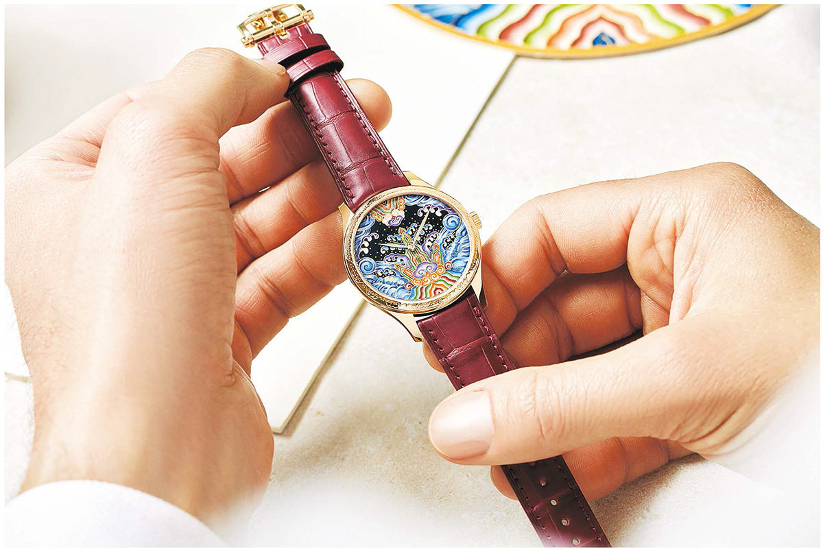 表盤上的「海水江崖紋」總共使用220根金線匠心製作,多層琺瑯塑造不同顏色和亮度,每層琺瑯均經過窰爐單獨燒製,工藝大師需至少70小時才能製作出斑斕色調。燒製後工匠再作拋光打磨,確保金色掐絲呈現最佳質感,最後再在表面加上半透明琺瑯塗層,為表盤增添閃爍光澤。雕刻大師另外在表圈上加入手工鐫刻的蝙蝠圖案,因為「蝠」與「福」同音,代表吉祥富足。傳統裝飾紋樣中經常出現的5隻蝙蝠圖案,正是「福祿壽喜財」五福臨門的意思。