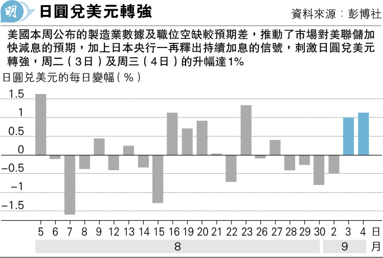 彭博經濟研究的分析指出,日本薪酬數據轉強,預示日本央行可能在10月討論加息,不過美國經濟的不確定性,意味日本央行官員對加息與否仍未有明確決定。美國7月JOLTS職位空缺降至767萬個,是3年半以來最低水平,反映就業市場動力轉弱。