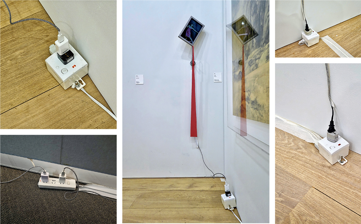相鄰畫廊佈展狀况有參差,瑞士藝術家Marck的多媒體作品《平衡》吊着電線,斜向延伸至旁邊水墨畫下,多重轉接下插到外露的插蘇上;據現場作品描述,作品不包括電線和插蘇。