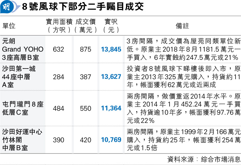 沙田第一城則有投資者在颱風下入市,美聯區域聯席董事黃錦瀚表示,一名投資者怕錯失筍盤,在前晚8號風球下睇樓後即入市,以387萬元購入沙田第一城44座中層A室,實用284方呎,兩房間隔,實呎13,626元。黃又稱,代理前晚協助送票到港島予原業主促成成交。資料顯示,業主2013年325萬元購入,持貨約11年帳面賺62萬元或近兩成。此外,區內代理亦稱,沙田好運中心竹林閣中層B室,實用390方呎,兩房間隔,以420萬元沽出,實呎10,769元。原業主1999年2月166萬元購入,持貨約25年帳面獲利254萬元或1.5倍。