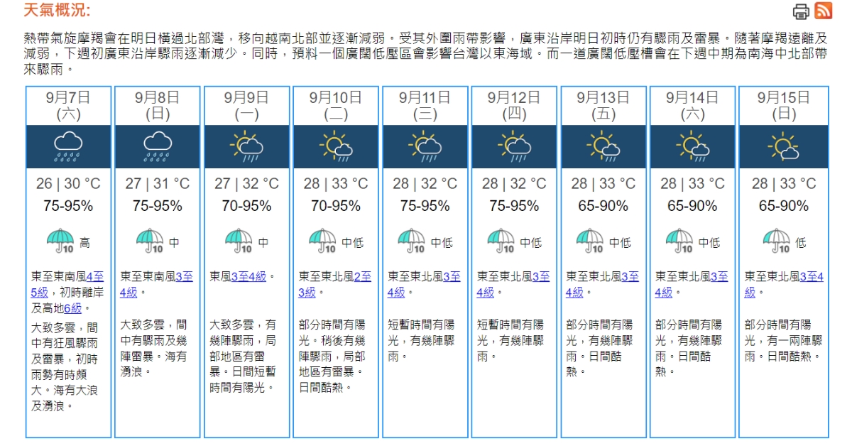 【19:00】受熱帶氣旋摩羯外圍雨帶影響,廣東沿岸明日(7日)初時仍有驟雨及雷暴。本港地區今晚(6日)及明日(7日)天氣預測:吹清勁至強風程度東至東南風,初時離岸及高地間中吹烈風。明日風勢逐漸減弱。大致多雲,間中有狂風驟雨及雷暴,初時雨勢有時頗大及有猛烈陣風。氣溫介乎26℃至30℃。海有大浪及湧浪。展望隨後兩三日驟雨逐漸減少,天色較為明朗。