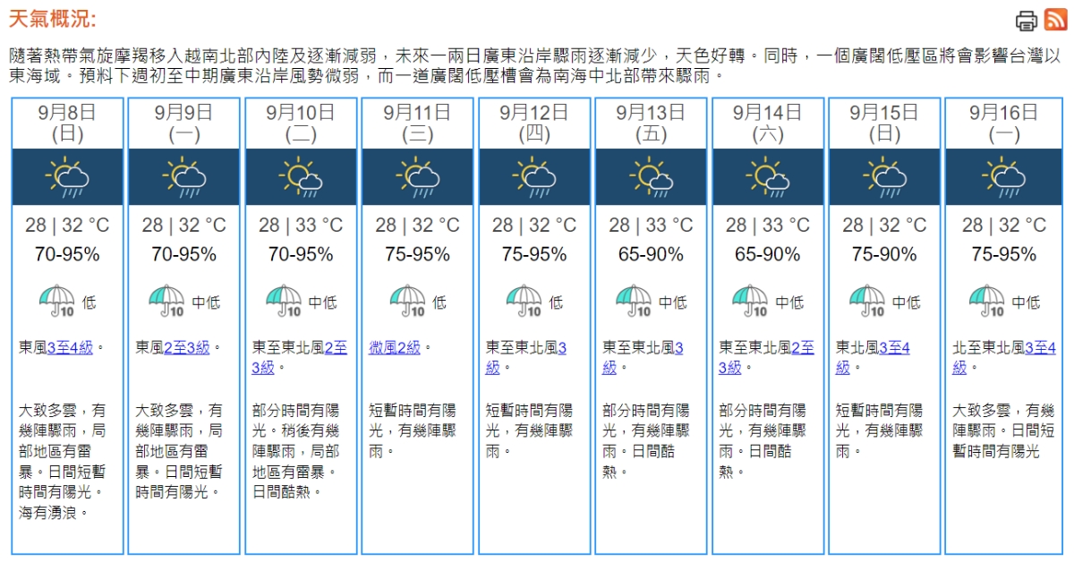 上午10時,天文台錄得氣溫29.4°C,相對濕度87%。本港地區今日天氣預測大致多雲,間中有驟雨及幾陣狂風雷暴。最高氣溫約31°C。吹清勁偏東風,初時離岸及高地吹強風。風勢逐漸緩和。海有大浪及湧浪。展望未來兩三日驟雨逐漸減少,天色較為明朗。