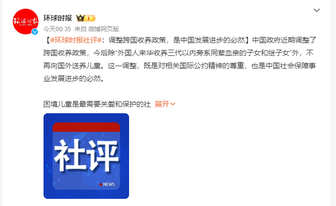 中國《環球時報》今天認為,困境兒童是最需要關愛和保護的社會群體之一。跨國收養政策的調整體現了中國政府對兒童權益保護的重視。《兒童權利公約》和《跨國收養方面保護兒童及合作公約》精神都強調確保兒童的最佳福祉,中國發展兒童事業的出發點與之完全一致,任何關於兒童權利保障的政策調整,都是將兒童的最大利益擺在首位並經過縝密調查研究後做出的,也將有助於在新形勢下更好地保護孤兒的合法權益。