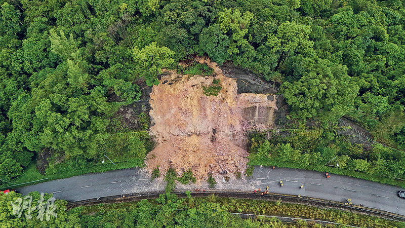 【明報專訊】超強颱風「摩羯」已遠離本港,但其外圍雨帶仍帶來連日暴雨。大埔新娘潭路近三担籮一處山坡受持續大雨影響,昨早山泥傾瀉,大量石塊連沙泥沿斜坡湧下行車路,來回行車線全封。消防處出動災難應變救援隊協助搜救,初步相信無人被困,相關部門已做緊急斜坡工程。受影響路段已於昨晚約11時重開其中一條行車線,以供單線雙程行車。