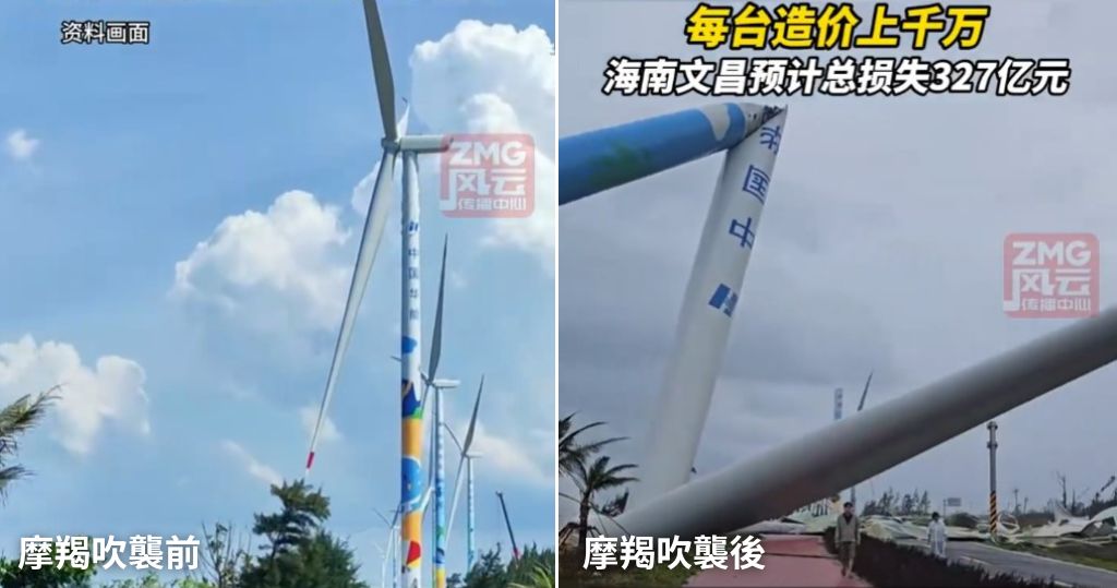 「摩羯」已先後登陸海南文昌、廣東徐聞,造成海南至少4人死亡、95人受傷、基建設施被毁。中通社今日(8日)報道,文昌市木蘭灣沿海風力發電場有多組發電機風車被颱風吹斷,營運商華能海南公司負責人表示,共有5至6台風電機組被吹斷,相關項目正在擴建,目前還未發電。報道引述業內人士稱,目前一台同型號風電機組造價近千萬元人民幣。
