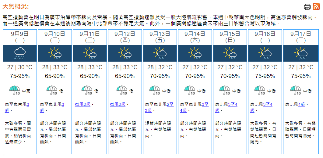 【19:00】本港地區今晚(8日)及明日(9日)天氣預測:大致多雲,間中有驟雨及雷暴,明日稍後驟雨逐漸減少。氣溫介乎27°C至30°C。吹和緩東至東南風。展望隨後兩三日部分時間有陽光及酷熱,局部地區有驟雨。