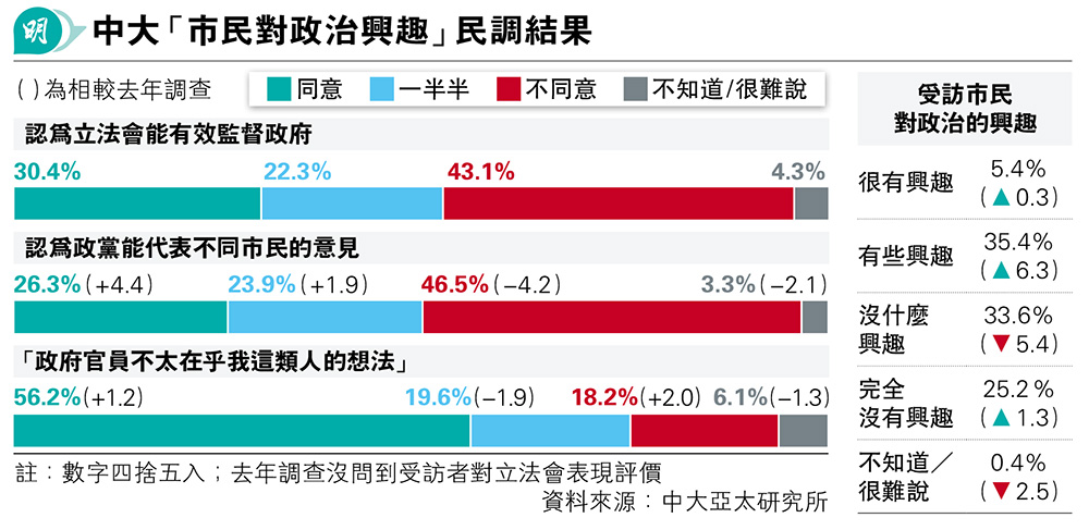 【明報專訊】中文大學亞太研究所昨公布「市民對政治興趣」民調結果,逾四成認為立法會未能有效監督政府,較認為能監督政府的三成高。約八成稱沒直接向政府或透過議員反映意見,過半受訪者認為政府官員「不太在乎我這類人的想法」。香港新方向立法會議員張欣宇表示,結果反映市民對政府及立法會的信任程度仍較低,議會有時予外界感覺儼如政府一部分,議員需加倍努力反映民意。