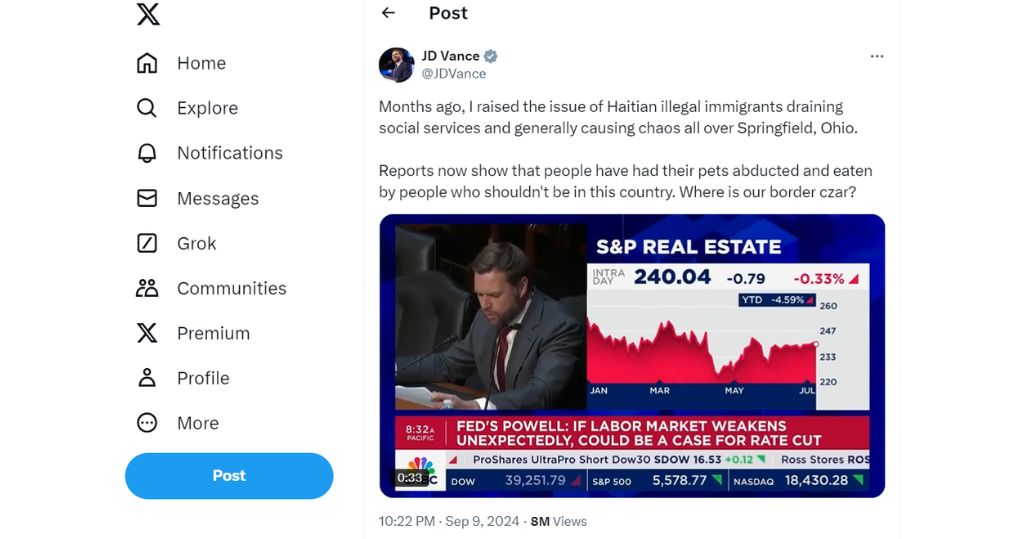 本身來自俄亥俄州的萬斯在X上寫:「海地非法移民耗盡社會服務,普遍在俄亥俄州斯普林菲爾德到處製造混亂」,還說「如今報道顯示有人的寵物被一些不該待在這個國家的人擄走和吃掉」。這些假消息一發不可收拾,一日就累積數以百萬計瀏覽次數,單計萬斯的帖子,截至本港時間今日(10日)下午約4時,就有多達800萬次瀏覽。
