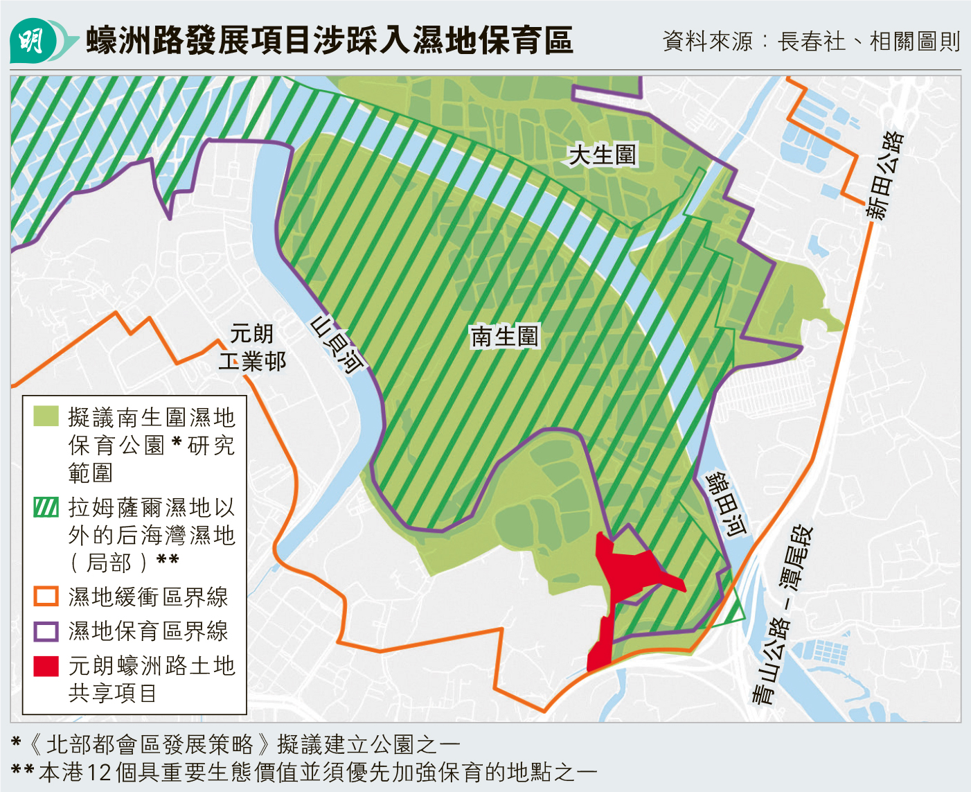 【明報專訊】元朗蠔洲路「土地共享先導計劃」申請項目正式進入城規程序,政府建議修訂南生圍分區大綱圖,將一幅位於濕地緩衝區內近6公頃的住宅用地高度限制,由6米放寬至100米,以興建7座公私營住宅,提供3100多伙。環團指出,該項目部分土地「踩入」土地共享計劃下的「地域限制」地區,亦即12個須優先保育地點之一「拉姆薩爾濕地以外的后海灣濕地」,若項目獲批,變相「打破政府自行設立的龍門」;此外,該項目亦位於擬議南生圍濕地保育公園的研究範圍,如項目先獲批之後再規劃濕地公園,會予人「先發展後保育」之感,擔心開壞先例。