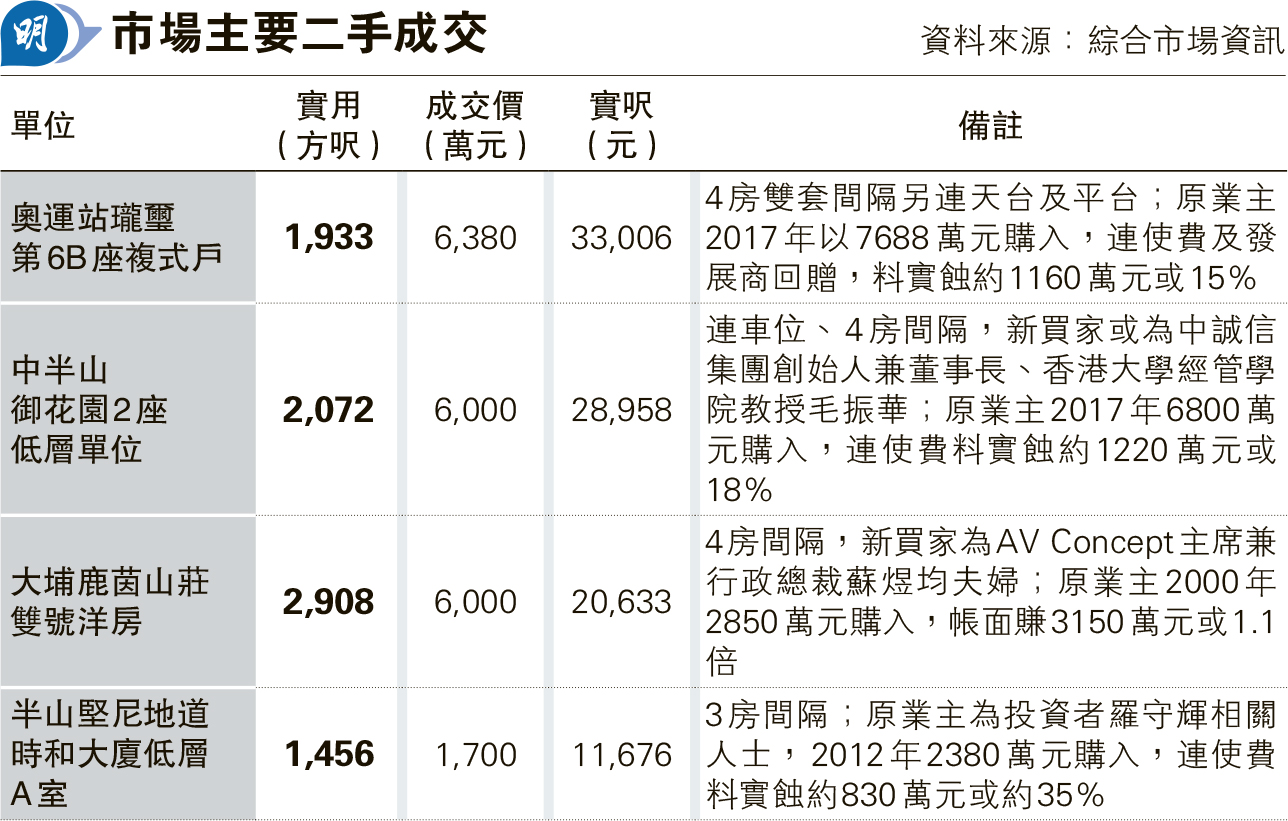 資料顯示,港島中半山御花園第2座低層單位,屬實用面積2072方呎3房1套間隔,早前以6000萬元連車位售出、實呎28,958元,買家以毛振華(MAO ZHENHUA)作登記,與內地評級機構、中誠信集團創始人兼董事長、中誠信國際首席經濟學家、香港大學經管學院教授毛振華名字相同,有機會為同一人;原業主於2017年底以6800萬元購入,持貨近7年,帳面蝕800萬元或12%,若連使費料實蝕約1220萬元或約18%。