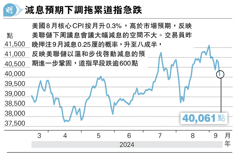 【明報專訊】美國整體通脹持續回落,8月消費者物價指數(CPI)按年升2.5%,較7月回落0.4個百分點,是連續第5個月按年升幅下滑,跌至2021年2月以來最低。不過剔除波動較大的食品及能源價格,美國8月核心CPI按月升0.3%,是連續第二個月升幅擴大,也是4個月以來最大升幅。按年計算,美國8月核心CPI升3.2%,維持在2021年4月以來低位。由於核心CPI按月升幅加快,並超出預期,令市場對美聯儲下周大幅減息的預期進一步降溫。