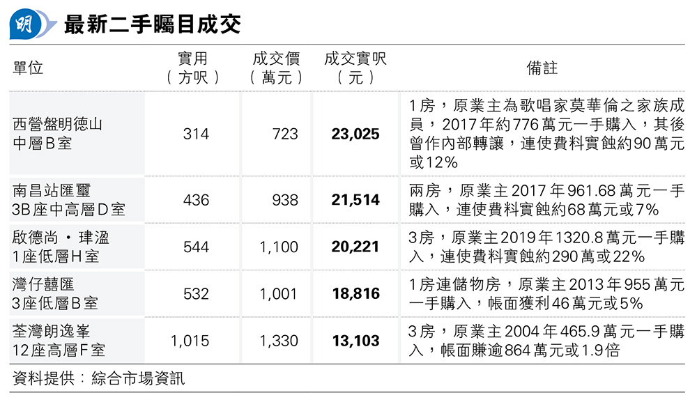 【明報專訊】市場靜待美國聯儲局下周公布議息結果前,二手市場依然不乏蝕讓個案。市場消息稱,著名歌唱家莫華倫家族之成員,新近以723萬元售出西營盤眀徳山中層B室,實用面積314方呎,1房間隔、實呎23,025元;原業主為莫華倫家族成員,於2017年以776萬元一手購入,及後曾以860萬元作內部轉讓,若以一手購入價比較,帳面蝕53萬元或7%,連使費料實蝕約90萬元或12%。