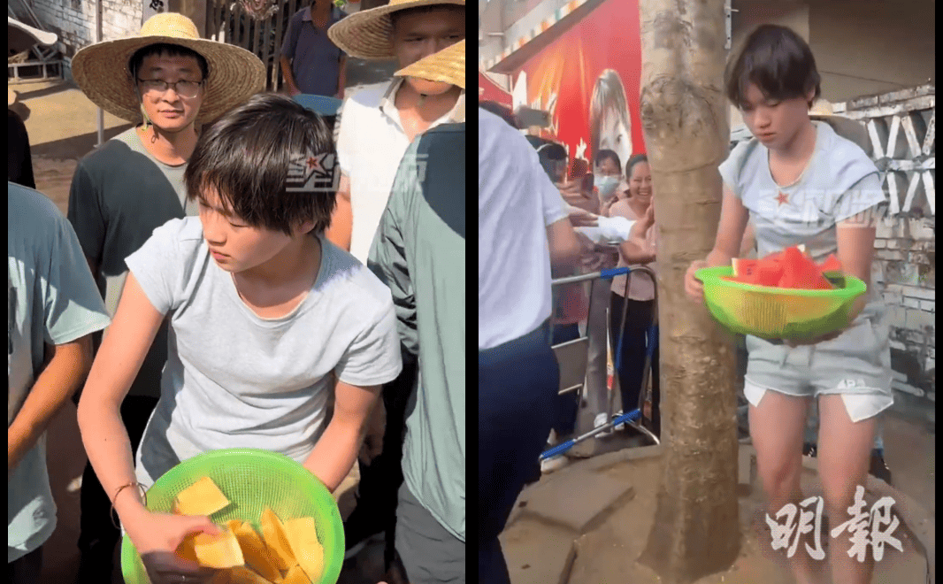 分發完西瓜,全紅嬋隨後又端出切好的哈密瓜派發。由於民眾太熱情,家人和志願者要在旁維持秩序。