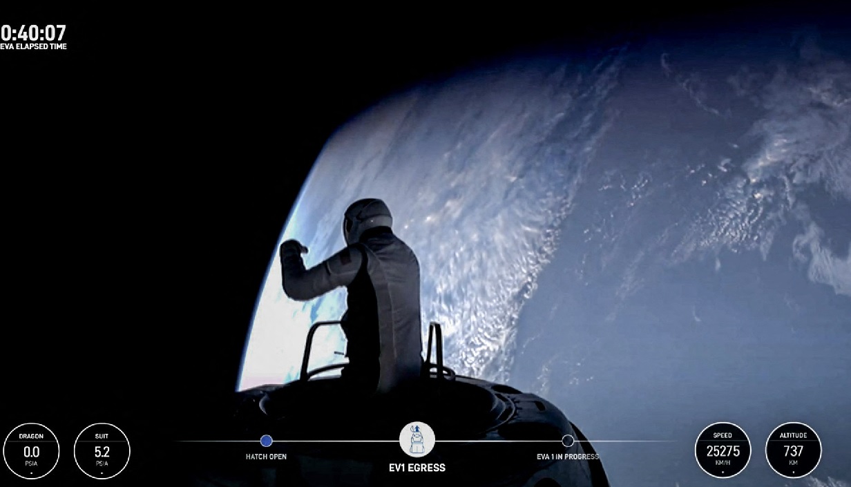 現年41歲的億萬富翁企業家艾薩克曼(Jared Isaacman)和30歲的SpaceX工程師吉利斯(Sarah Gillis)先後出艙。整個太空漫步歷時33分鐘25秒。