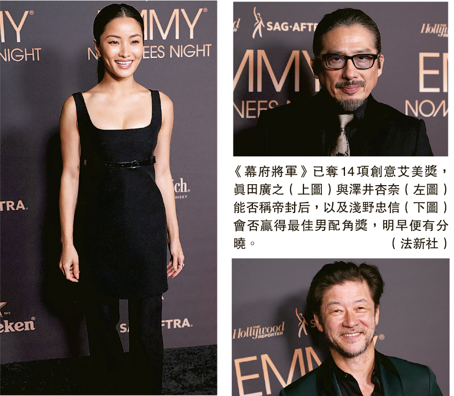 影視串流平台Netflix史上最高收視劇集《魷魚遊戲》,男主角李政宰兩年前在艾美獎雖捧走戲劇視帝殊榮,但未能拿下最佳劇集獎;今屆獲25項提名的《幕府將軍》,由《壯志凌雲:獨行俠》編劇賈斯汀馬克斯(Justin Marks)及其日裔妻子近藤麗素(Rachel Kondo)創作,故事講述公元1600年,日本正值「百年內戰」,將領吉井虎永因威名成為眾矢之的,為求保命,必須對抗來自攝政委員會成員的聯手致命攻擊,神秘英國水手John Blackthorne此時出現,成為有力扭轉虎永劣勢的關鍵。上周主要頒發技術獎的創意艾美獎,《幕》劇率先橫掃14獎,因此明日頒發主要獎項,《幕》劇被美媒看好可成為首部拿下戲劇最佳劇集的非英語作品;扮演吉井虎永的真田廣之,以及飾演英國水手翻譯的澤井杏奈,也有機會稱帝封后。事實上,真田廣之、澤井杏奈與有份演出的淺野忠信、穗志萌香已抵達洛杉磯展開連串活動。真田廣之表示該劇拍竣後已近兩年沒與劇組見面,趁這次頒獎禮,正好乘機敘舊。