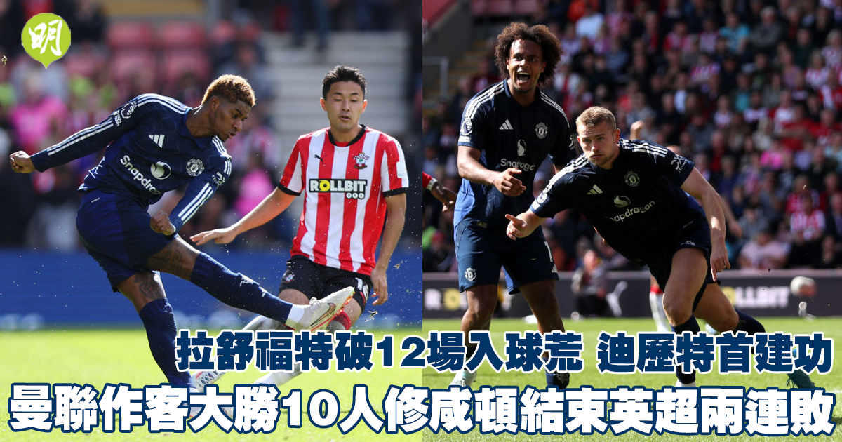 曼聯開季3場1勝2負得3分,賽前還有領隊坦夏格遭舊將基斯坦奴朗拿度(C朗)再次受訪炮轟。今仗作客有阿仙奴前門將蘭斯達爾把關的修咸頓,「紅魔」中場以基斯甸艾歷臣取代卡斯米路任正選。初段受壓的曼聯33分鐘因達洛治犯規先輸12碼,甘馬倫阿奇操刀被奧拿拿「捉到路」撲出。大難不死的紅魔於2分鐘後打開紀錄,隊長般奴費南迪斯接應角球短傳後傳中,剛於歐國聯為荷蘭隊頻犯錯的馬菲斯迪歷特飛身頂向遠柱入網,攻入加盟首個入球。曼聯41分鐘再下一城,拉舒福特左路起腳彎入網窩,取得今季首個入球,兼打破自今年3月後連續12場賽事入球荒。