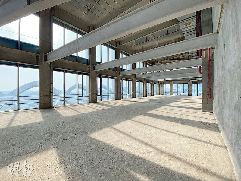橫琴國貿微信公眾號介紹,該廈由珠海藍琴發展有限公司開發,建築面積13萬平方米,除了商舖、辦公及商務用途外,天台還設空中直升機停機坪。但雖已建成6年,不單半數樓層空置,空置樓層環境仍相當「原始」。記者沿走火樓梯由最高的45樓逐層觀察,31至45樓內部全為灰色水泥牆身,沒任何裝潢,腳下地磚未鋪,抬頭是外露的水管及電線槽走線,各層升降機大堂貼有用白紙列印的樓層編號。本應是景觀最佳、最具租賃優勢的高層辦公室卻荒蕪一片。