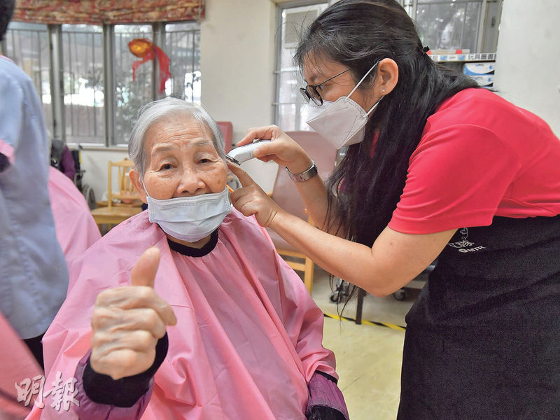 【明報專訊】「婆婆,你今日想剪咩髮型?」伸手助人協會樂富護老院大廳上周六搖身一變,成為長者院友的半日限定理髮廳,地板佈滿灰白髮絲。港鐵「鐵路人 鐵路心」義剪隊員穿上圍裙、拿起剪刀髮梳,為老友記剪出新髮型迎中秋。有義工說,為長者義剪不但是貼身服務,更包含貼心聆聽,讓長者感受關愛。