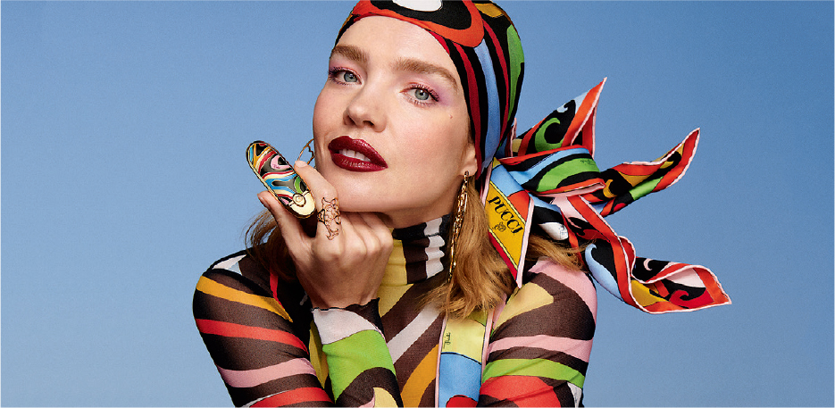 經典時裝品牌Pucci,由創辦人Emilio Pucci於1947年在佛羅倫斯創辦。出自他手筆的繽紛色彩印花圖案Marmo,於1968年面世,靈感源自艷陽倒映在地中海泛起的漣漪,不但在1960、70年代席捲時尚界,時至今天依然是品牌的招牌作。來到品牌現任藝術總監Camille Miceli手中,她再次將之發揚光大,應用於與法國品牌Guerlain合作的限量聯乘系列中,為系列彩妝產品披上這個用色大膽的印花圖案。