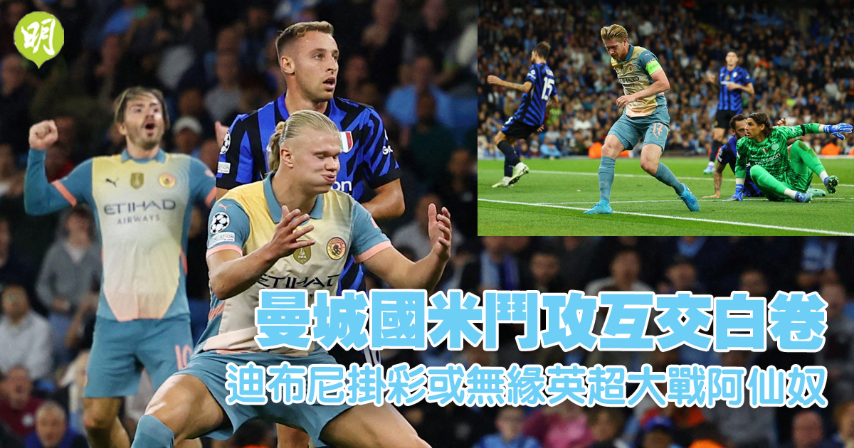 曼城今晨(19日)在新制歐聯首戰雖有主場之利,卻被前季決賽手下敗將國際米蘭取得不少攻勢,惟兩軍終忘帶射門鞋下互交白卷,令箭頭艾寧夏蘭特未能達成效力「藍月」入100球的里程碑,更有隊長奇雲迪布尼因傷下半場被調走,下周一凌晨英超主場大戰阿仙奴時上陣成謎。