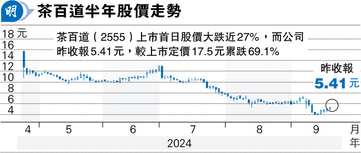 報道指監管部門暫停珍珠奶茶企業上市計劃,源於茶百道(2555)來港掛牌首日、股價便大跌近27%引發。茶百道今年4月來港上市,集資近26億元,當時公開發售部分認購不足額,而公司昨收報5.41元,較上市定價17.5元已累跌69.1%(見圖)。而作為茶百道之前在港唯一上市的茶企奈雪的茶(2150),2021年以每股19.8元定價上市,昨收報1.33元,股價已累計下跌93.3% 。
