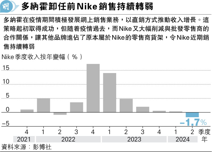 多納霍2020年接任Nike行政總裁前,曾是電商平台eBay的行政總裁。Nike當年招募他成為CEO,是希望他為品牌引入更多科技及數碼營銷策略。疫情期間,多納霍積極發展網上銷售業務,大量分銷商被終止合作,讓Nike以電商及自營店的直銷模式增加收入。這策略起初取得成功,但隨着疫情過去,顧客重返商店購物,而Nike與分銷商的合作大減,讓其他品牌進佔了原本屬於Nike的零售貨架,令Nike近期銷售持續轉弱。