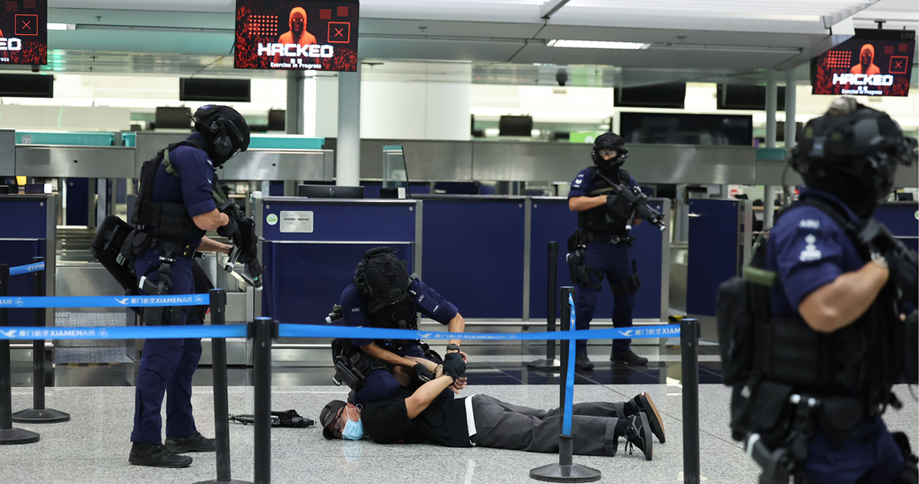 機場警區和新界南總區衝鋒隊及時制止並拘捕該三名恐怖分子。在網絡安全方面,網罪科人員為應對香港國際機場的電腦系統遭受非法入侵,進行了電腦事故應變,數碼法理鑑證及系統復原工作,並與國際刑警組織及澳門司法警察局互換情報,最終由澳門司法警察局在澳門成功拘捕其他涉案在逃的恐怖分子。