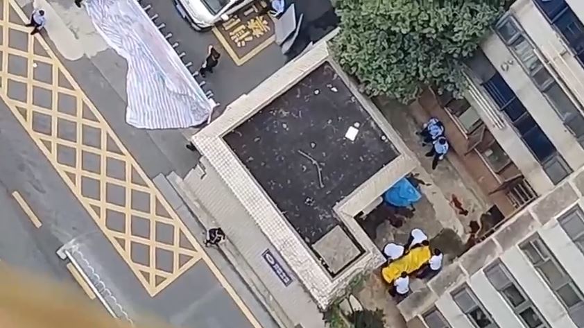 9時17分,江X輝將兩個窗簾打結,綁在陽台中間的窗框處,企圖通過窗簾下滑至12樓逃離現場時墜樓身亡。