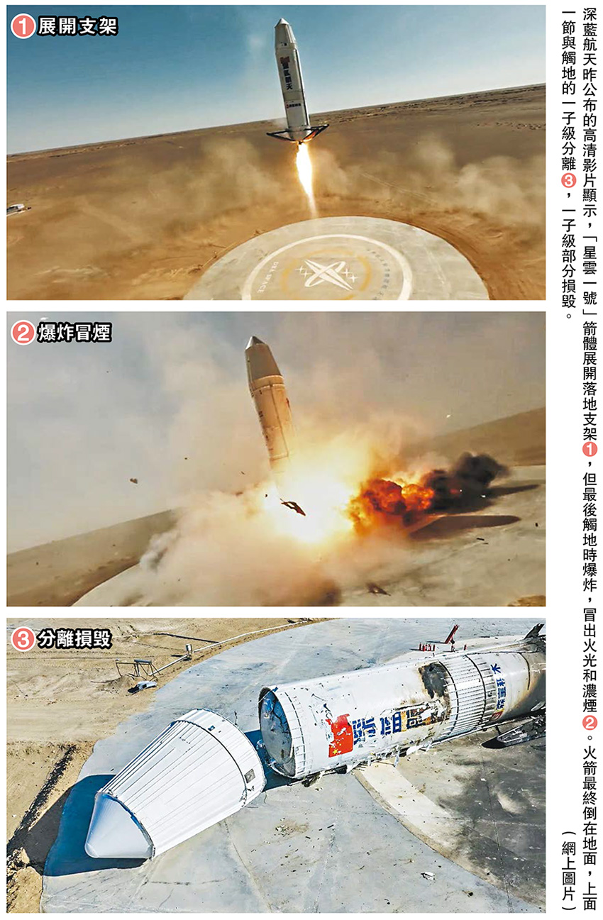 深藍航天昨公布的高清影片顯示,火箭引擎在接近地面近10米時熄火,箭體直接觸地爆炸,冒出火光和濃煙,碎片四濺。另一張圖片顯示火箭倒在地面,上面一節與觸地的一子級分離,一子級出現部分損毀。深藍航天表示將於11月再次執行高空垂直回收任務。