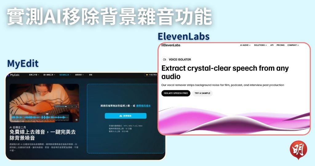 ElevenLabs「Voice Isolator」能夠移除雜音;在MyEdit「去雜音」即使調較了雜訊降低程度至100%,聲檔亦有零碎雜音出現。