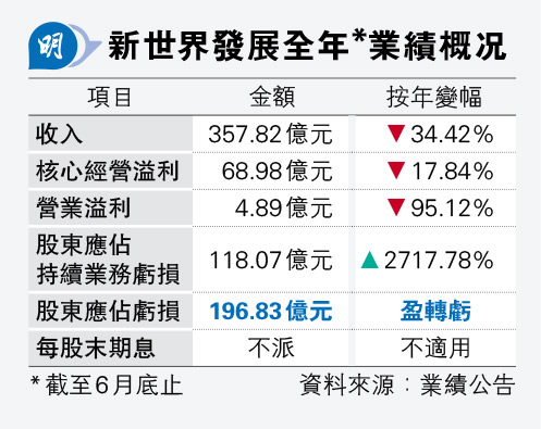 【明報專訊】新世界昨日亦公布截至6月底止全年業績,錄得股東應佔虧損196.83億元,為2004年度以來首次錄得虧損,虧損金額更打破公司上市以來紀錄。雖然包括出售新創建(0659)錄得虧損83億元,以及投資物業減值92億元項目均屬非現金成分,集團核心經營溢利仍有68.98億元只按年減少17.84%,但集團因應虧損不派末期息,則為上市以來首次。