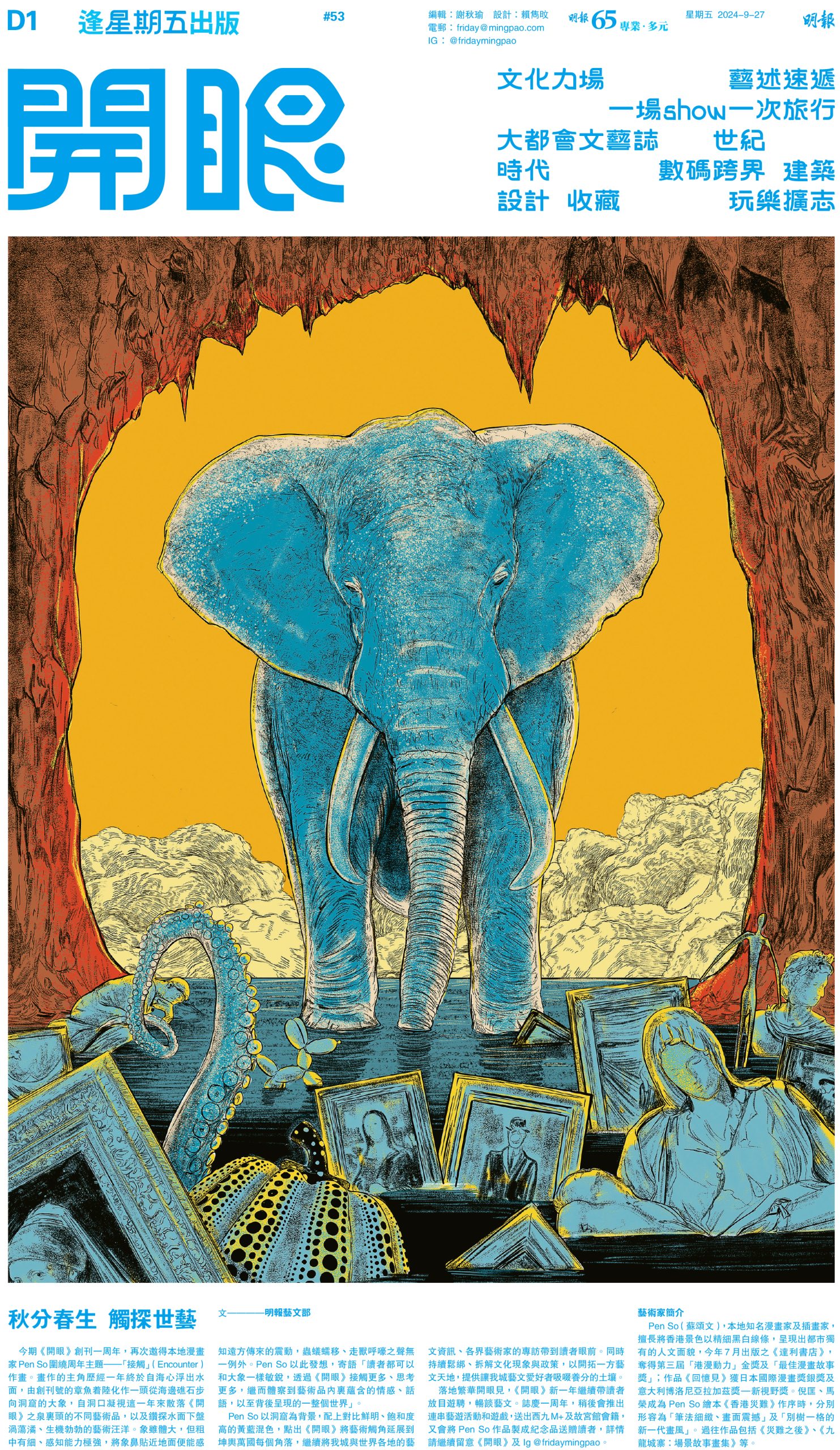 【明報專訊】今期《開眼》創刊一周年,再次邀得本地漫畫家Pen So圍繞周年主題——「接觸」(Encounter)作畫。畫作的主角歷經一年終於自海心浮出水面,由創刊號的章魚着陸化作一頭從海邊礁石步向洞窟的大象,自洞口凝視這一年來散落《開眼》之泉裏頭的不同藝術品,以及鑽探水面下盤渦蕩潏、生機勃勃的藝術汪洋。象雖體大,但粗中有細、感知能力極強,將象鼻貼近地面便能感知遠方傳來的震動,蟲蟻蠕移、走獸呼嚎之聲無一例外。Pen So以此發想,寄語「讀者都可以和大象一樣敏銳,透過《開眼》接觸更多、思考更多,繼而體察到藝術品內裏蘊含的情感、話語,以至背後呈現的一整個世界」。