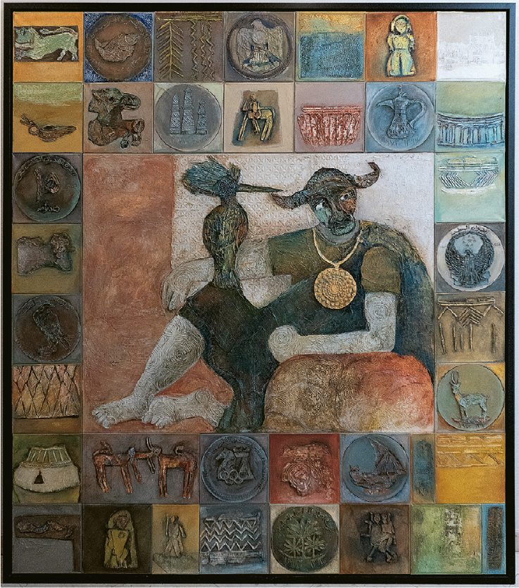 【明報專訊】白天溫度高達40℃,人們不宜外出,令原本少人的街道更為冷清。極端的沙漠氣候令人誤以為這裏草木不生,其實只是一個錯覺。阿拉伯地區在石器時代的氣候並非如此嚴峻,而在一片黃土大漠地下,其實隱藏着很多舊日文明的蹤迹,有着多個文化遺址。最近探訪了一位本土阿聯酋藝術家Salma Al Marri,她很沉迷阿拉伯半島一帶的史前研究,時常融入於她的創作當中。年約60歲的她,是位舉止優雅的女士。其丈夫曾為阿聯酋駐科威特的大使,除了藝術創作外,她亦曾擔任阿聯酋教育局的資深藝術總監。或許因為出生在阿聯酋立國之前,Salma對於原生地的歷史及文化的關懷是超越了國家身分,很純粹地回歸到對土地的熱愛。其作品以畫作及移印為主,題材圍繞着阿拉伯半島的生活及歷史。作品Tales of Land Collection於2015年創作,結集多個阿拉伯半島土地相關、跨越多個世紀的符號及物件,例如伊斯蘭教出現前的人形雕塑、近來出土屬於4000年前的金飾,以及阿聯酋立國時的硬幣等。畫作帶有雕塑的質感,是藝術家自創的製作手法。她喜歡將厚厚的塑膠彩塗在帶有花紋的物件上,待塑膠彩乾透後撕下,再貼在畫作之上。這種手法亦教人聯想起化石標本的製作手法。此外,畫作中描繪了一名半人半牛的角色,英偉地坐着。Salma說那是她常會夢見的靈性動物。對她來說,牛是一個守護此地的靈性存在。