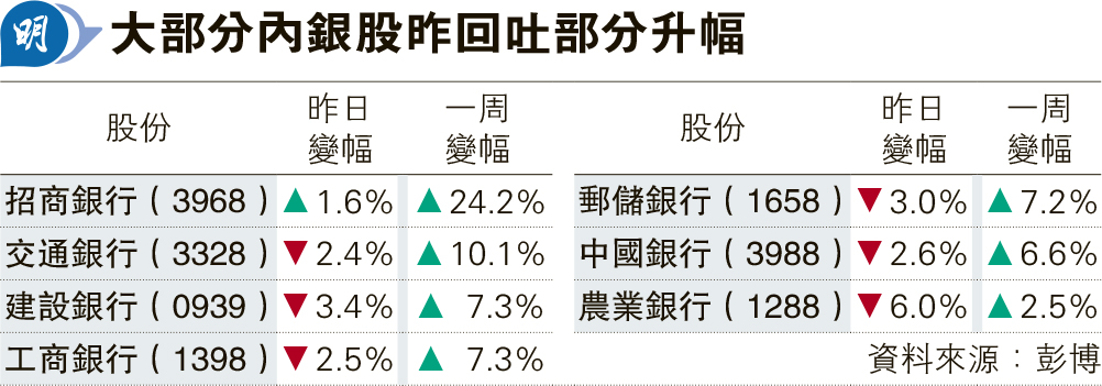 【明報專訊】人行本周二預告降準減息後,即使人行表明擬增六大內銀核心資本充足率,其後市場更傳出當局擬向六大行注資1萬億元(人民幣,下同),惟市場對銀行盈利受壓、面對融資壓力的憂慮揮之不去。內銀股於本周二起連升3日後,昨在減息降準消息出爐後紛高位回吐,只有招行(3968)仍錄溫和升幅。農行(1288)昨逆市大跌6%,但內銀本周仍全線隨大市上升(見表)。