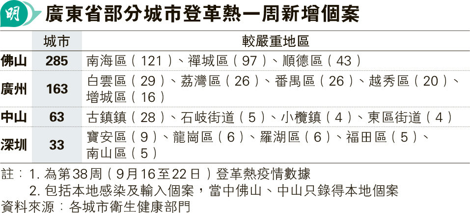 翻查廣東省各城市衛生健康部門公開資料,今年第38周(9月16至22日)廣東全省新增登革熱感染764宗,較對上一周減少11宗。佛山市錄得最多新增個案,共285宗(見表),皆為本地感染;而港人最常去的深圳新增33宗,寶安區、龍崗區、羅湖區及福田區皆錄得本地感染。