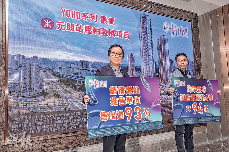 至於新地同系元朗The YOHO Hub II,同於上周六推售第6座首批120伙,最終沽出112伙或93%;新地再加推94伙,維持最高直減折扣15.5%,折實均呎15,127元,部分單位提價1%;新推單位屬兩房及3房戶,實用面積462至901方呎,折實價666.1萬至1429.2萬元、折實呎價1.33萬至1.79萬元,料日內公布銷售安排。