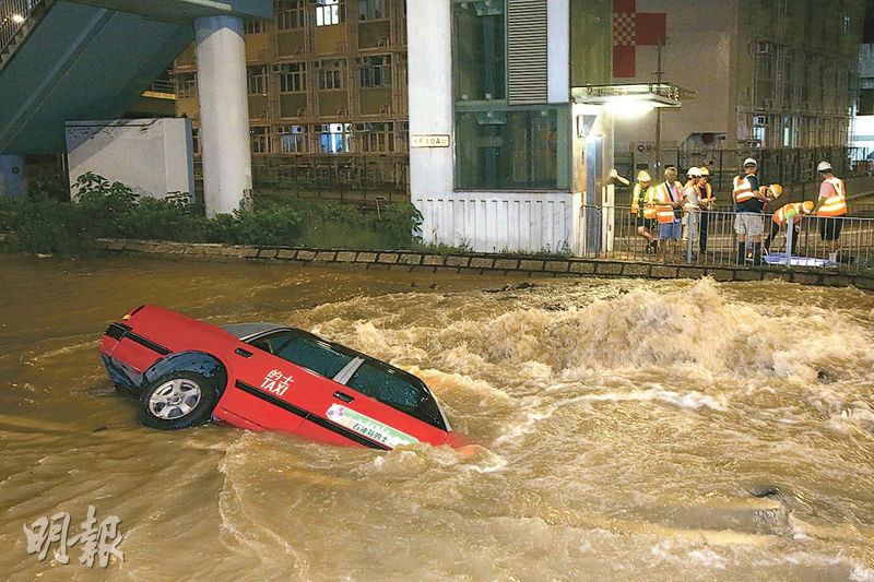 59歲蕭姓男司機昨凌晨零時許駕駛的士沿荔枝角道往旺角方向行駛,至近長沙灣警署對開,掉進路面坑洞,司機與乘客隨即離開車廂。蕭向到場傳媒稱,駛至時見路面有積水,因右線有車趕不及切線及收掣,左前轆陷進坑洞,車身輕微傾斜,初期水深約至腳眼,及後不斷上升,遂與乘客涉水離開車廂,其間曾返回嘗試救車,但被警員勸止。蕭報稱頭暈及四肢乏力,由救護車送院檢查。