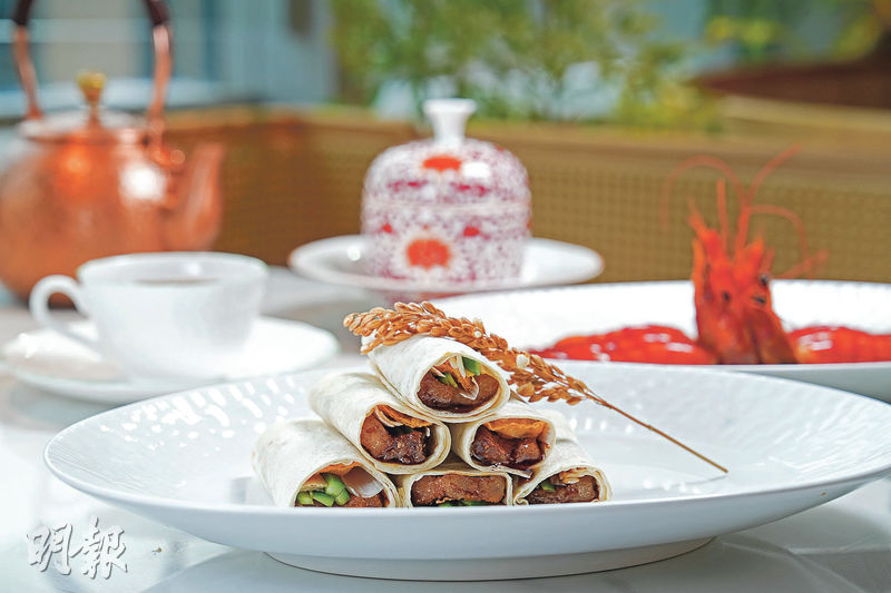 傳統浙菜還有「西湖蓴菜斬魚圓」,俞斌說:「將魚肉斬成魚圓後加些肥膘(豬肉肥膏),非常鮮嫩細滑。」內地多以鮰魚這類淡水魚製成魚圓,香港店則改用海魚。雞湯內有一大顆魚圓連西湖名物蓴菜,鬆軟鮮甜。另一道東坡小牛肉,是東坡肉的變奏版,牛小排以紅燒手法製作,濃油赤醬,軟腍程度和味道,令人以為是五花肉。面餅醬香五花肉,則用面餅捲着富醬油香的炸五花肉片、青瓜絲、葱絲,濃味中帶點清爽,非常冶味。