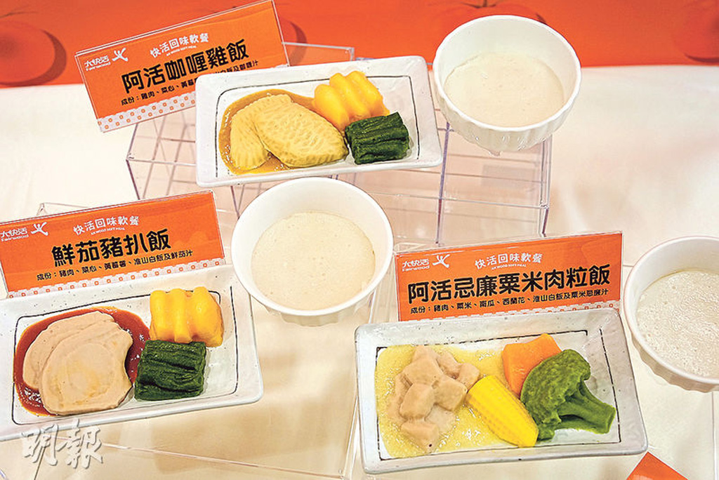 大快活9間分店今日(10月1日)起推出面向吞嚥困難人士及長者的「快活回味軟餐」,4款港式菜軟餐包括:「阿活咖喱雞飯」、「鮮茄豬扒飯」,以及10月中推出的 「阿活忌廉粟米肉粒飯」及「菠蘿咕嚕肉飯」,劃一定價58元。每間分店每日備貨80份,全部以外賣形式供應;顧客亦可通過WhatsApp訂購並安排送貨,訂單滿500元可享免運費。