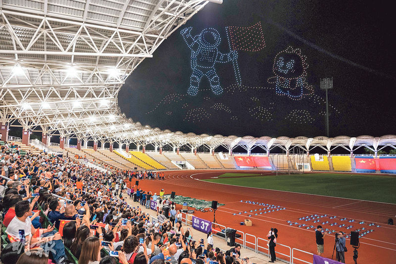 【明報專訊】連續兩晚賀國慶無人機表演因天文現象干擾信號而取消。昨晚7時東區民政事務處順利於小西灣運動場舉辦國慶75周年無人機表演,負責的無人機表演公司營運總監陳嘉明感謝天公作美,笑言昨晚能起飛「帶幸運成分」。